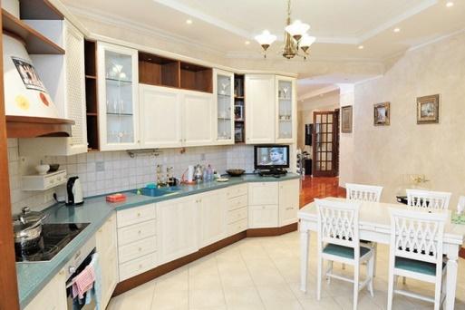 Проходная кухня оформлена в светлых тонах. Это помещение, по признанию хозяев, является их любимым местом. Здесь же живет любимец семьи попугай по кличке Кеша. Фасад кухонного гарнитура выполнен в молочном цвете, а столешницы с голубым оттенком. Рядом стоит просторный обеденный стол прямоугольной формы, винный шкаф и организована закрытая система хранения.