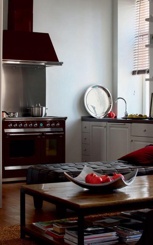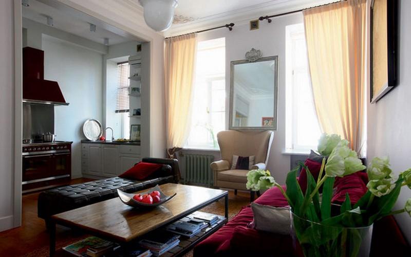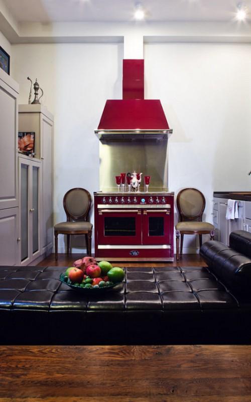 Гостиная соединена с небольшой кухней. Подоконник объединен с рабочей поверхностью, а под ним вмонтирован полноценный кухонный блок. Немного в стороне стоят вытяжка и плита.