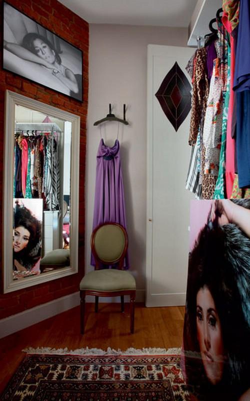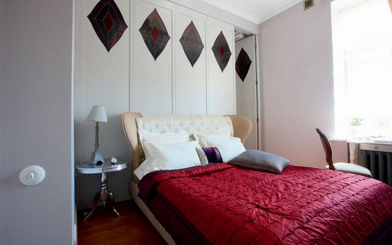 За спинкой кровати в спальне находится небольшая гардеробная, их разделяет перегородка, изготовленная из дерева с витражными окнами.
