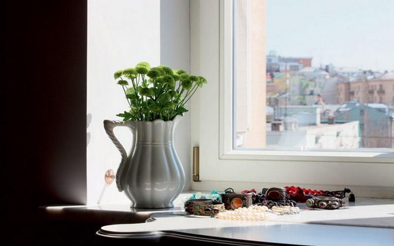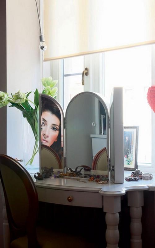 Одним из оригинальных решений в спальне стал туалетный столик, имеющий единую столешницу с окном.