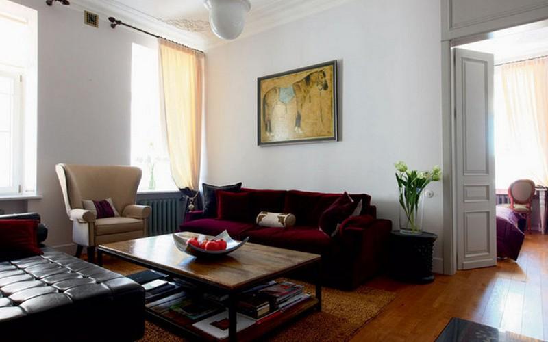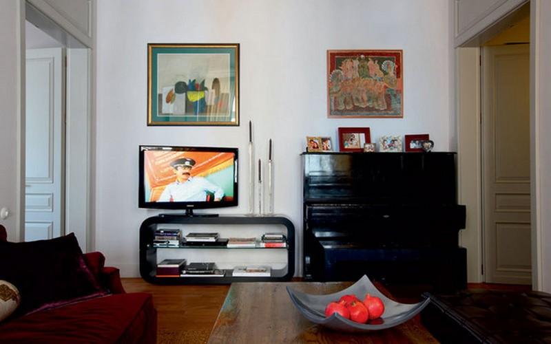 По задумке дизайнера все стены окрасили в светло-серый цвет, что хозяйке изначально не понравилось, но в дальнейшем это решение ей пришлось по душе. В гостиной стоит бордовый диван, обитый бархатом, а над ним картина Ираклия Сутидзе. Другая картина этого же художника находится над пианино «Енисей», которое осталось хозяйке от предыдущих жильцов.