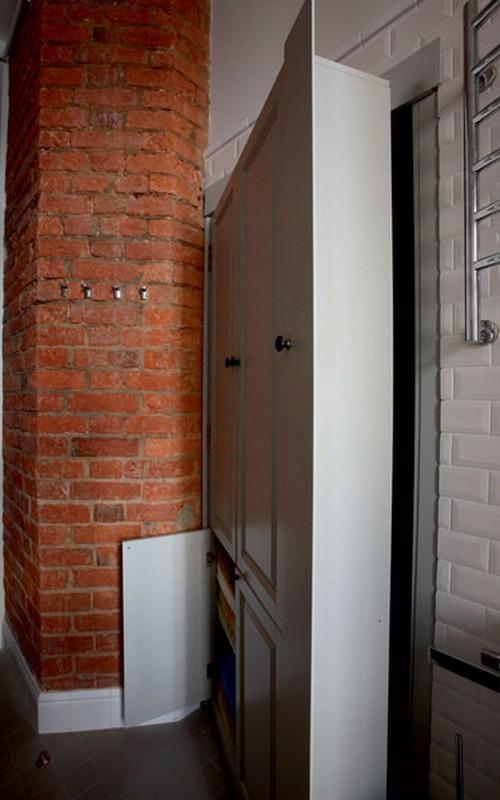 По примеру французских интерьеров, здесь многое удалось скрыть за потайными дверьми и шкафами. На место забитой двери на черный выход удалось вмонтировать шкаф, а за ним обустроить небольшую кладовку.