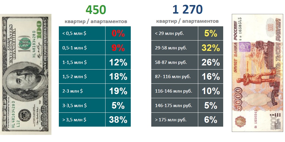 До последнего времени элитная недвижимость традиционно номинировалась в долларах. Но в конце прошлого года наметился переход в рублевые цены. Казалось, к 2015 г. рублевые ценники будут повсеместны. На самом деле установился паритет — 74% квартир номинируются в рублях, остальные — в долларах (это не значит, что сделки заключаются тоже в долларах — речь идет об официальных прайсах). В случае с очень дорогими объектами об окончательной цене традиционно договариваются при закрытых дверях.