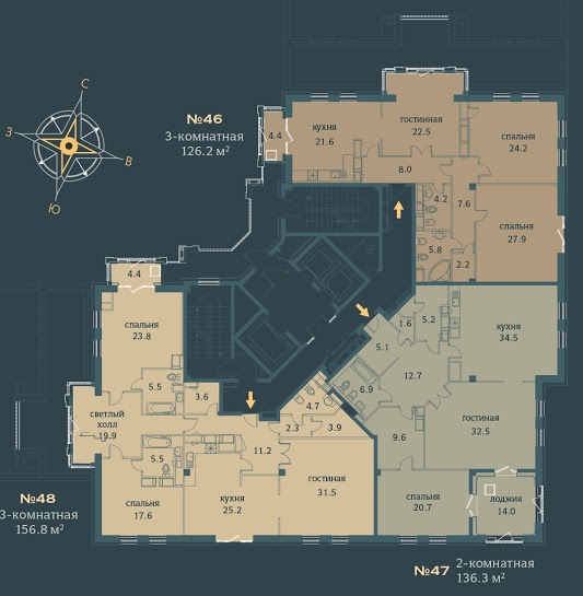 Схема одно из этажей клубного дома «Люмьер». Обратите внимание на зонирование пространства — в каждой квартиры выделены приватная и гостевая зоны. Однако планировки предусматривают большое количество «закуточков». А в средней квартире в одну из спален надо проходить через гардеробную.