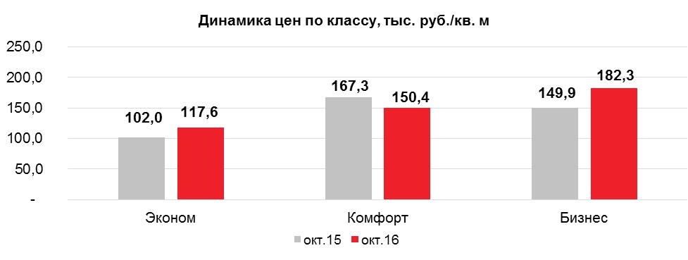 Наибольший годовой прирост цены на 21,6% зафиксирован в новостройках бизнес-класса, что обусловлено ростом стадии строительства проектов. В эконом-классе средневзвешенная цена увеличилась на 15,4% по мере вымывания наиболее привлекательного предложения и повышения готовности уже реализуемых объектах.