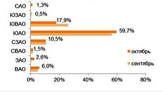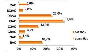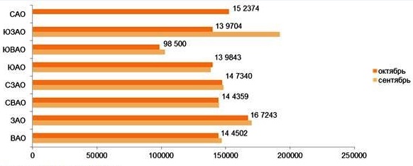 В октябре можно было наблюдать незначительное снижение цен практически по всем округам: ВАО (-2%), ЗАО (-2%), ЮВАО (-4%), ЮЗАО (-27%). Рост цен отмечен только в ЮАО (на 2%).