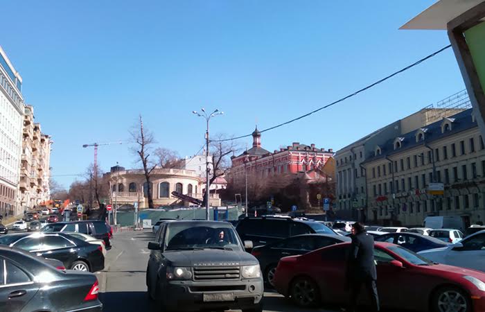 На перекрестке у Цветного бульвара всегда много машин – на паркинге и дорогах.