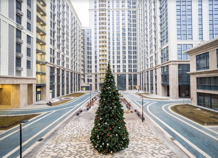 Внутренняя территория площадью 4,5 тыс. кв. м разделена на две зеркальные части, изолированные друг от друга. Здесь обустроены детские площадки с горками и качелями, зона воркаута, беговая дорожка, тренажеры и скамейки с подсветкой. Композиционным центром двора станет площадка для праздников с рождественской елью. На территории также организована высадка различных деревьев и кустарников.