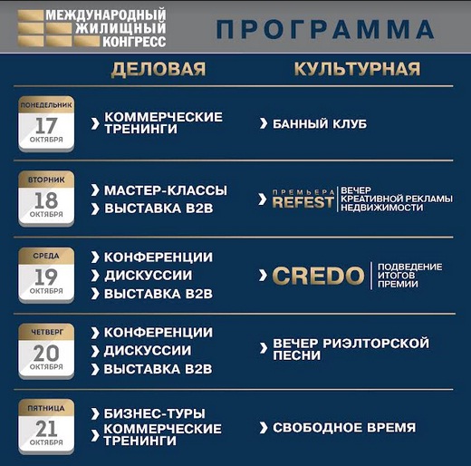 Уверены, что вас приятно удивит деловая программа. Мы сохраним тематические линейки мероприятий по всем важнейшим сегментам рынка (новостройки, загород, elite estate, ипотека, маркетинг, технологии, менеджмент и т.д.) и значительно обновим содержание программы. В общей сложности пройдет порядка 450 мероприятий, выступят свыше 500 спикеров.