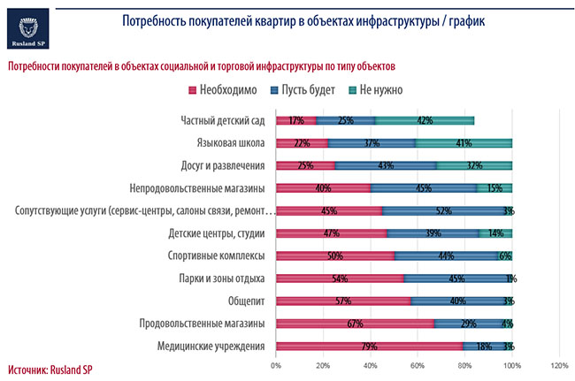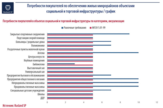 Опираясь на проведенные компанией Rusland SP исследования видно, что рыночная потребность в некоторых категориях инфраструктуры выше, чем установленные нормативы МГСН 1.01–99. А ведь как правило, девелоперы ориентируются на эту документацию и выполняют программу по минимуму.
