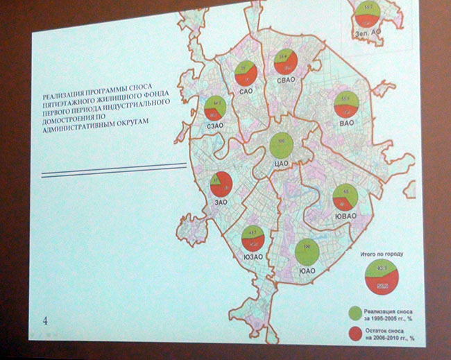 Реализация программы сноса пятиэтажного жилищного фонда по административным округам по состоянию на 2006—2010 гг.