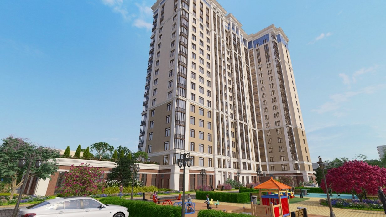 В составе комплекса будет построено два 19-этажных корпуса, объединенных общим цокольным этажом. Фасады зданий классической архитектуры будут облицованы плитами из натурального камня двух спокойных тонов.