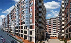 Внутреннее пространство двора озеленено и благоустроено цветниками и газонами. В подземной части находится паркинг на 270 машиномест.